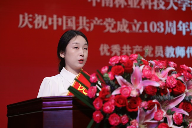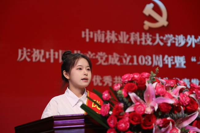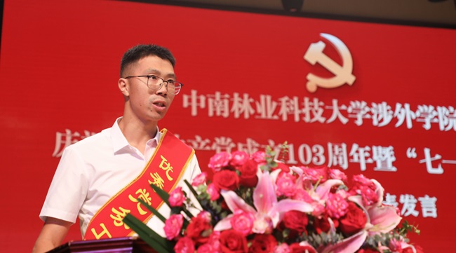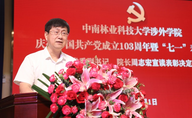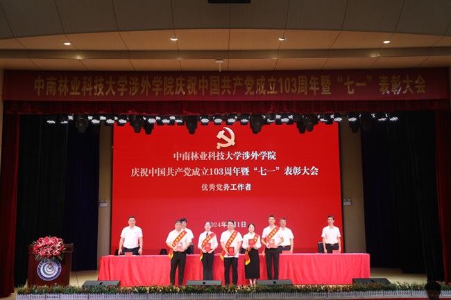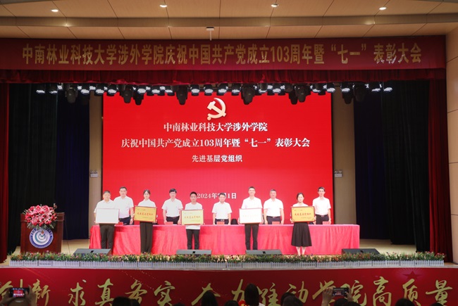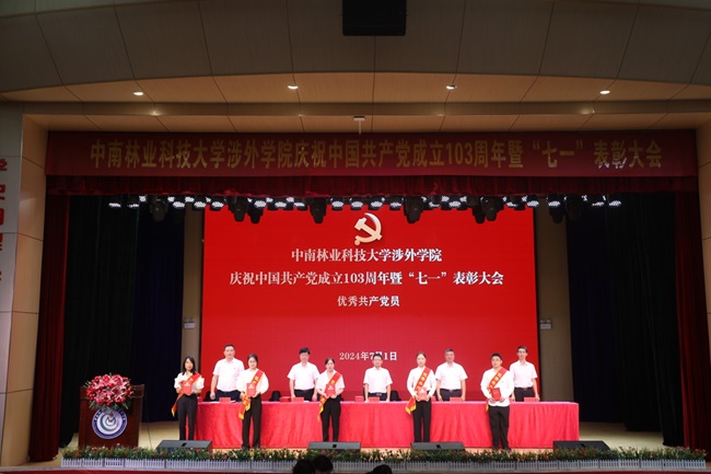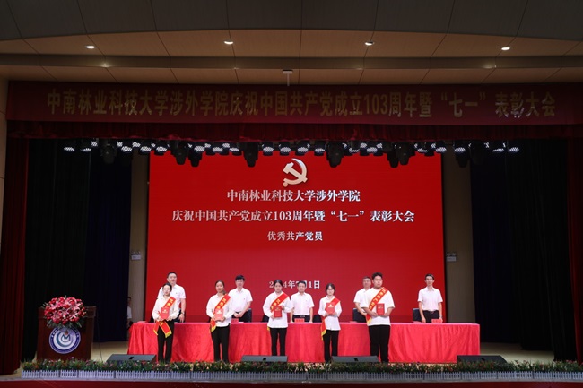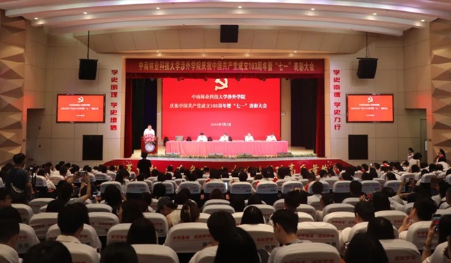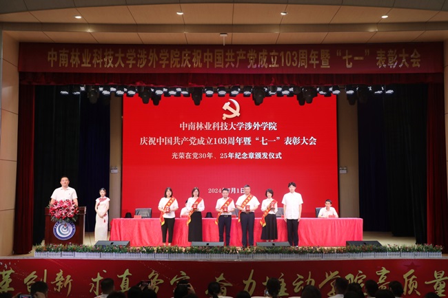 7月1日上午,中南林业科技大学涉外学院在学术报告厅隆重召开中国共产党成立103周年暨“七一”表彰大会,深入学习贯彻习近平新时代中国特色社会主义思想,重温党的光辉历程,弘扬党的优良传统,讴歌党的丰功伟绩,为光荣在党30年、25年的老党员颁发纪念章,表彰优秀共产党员、优秀党务工作者和先进基层党组织,激励学院各级党组织和广大党员干部初心不改、奋斗不息,走好新的赶考路。