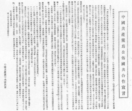 9月22日,国民党中央通讯社发表《中共中央为公布国共合作宣言》;23日,蒋介石发表实际上承认共产党合法地位的谈话。中共中央的《宣言》和蒋介石谈话的发表,宣告国共两党重新合作和中国抗日民族统一战线的形成。