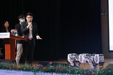 科技作品展示环节,来自电子信息工程专业万宇杰同学和他的团队为大家介绍了“可预约智能无人充电桩系统”和“红外热像搜救仿生机械狗”两个作品。计算机科学与技术专业雷思骞同学和软件工程专业廖涛同学带来的是“基于用户行为的新能源汽车预约系统”作品展示。两个团队的作品凭借着新颖的构思、巧妙地设计斩获了多项国家级、省级奖项。