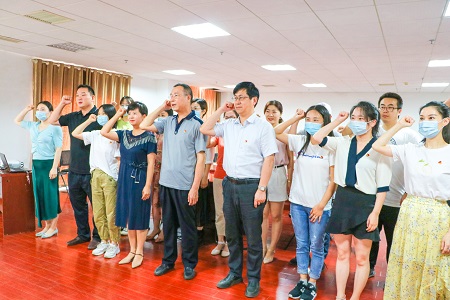 党委书记章元日带领与会党员面向党旗重温入党誓词,铭记入党初心,铿锵恢弘的誓词,强烈震撼着在场的每名党员,一字一句,神圣而豪迈,体现了与会党员对中国共产党的无限忠诚,进一步坚定了党员的理想信念。