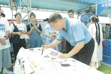 领导、师生现场毛笔书法赠新生