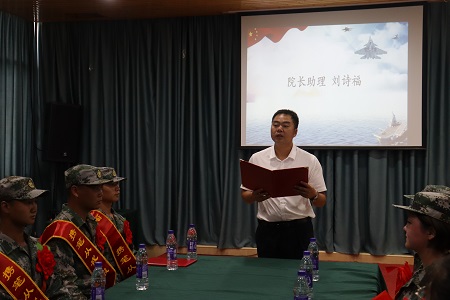 齐程程副处长首先对与会的领导、老师和同学表示欢迎,对9名光荣入伍的大学生新兵表示热烈祝贺。她指出,在今年新冠肺炎疫情多点散发的特殊背景下,我院钟委军等9名同学依照中华人民共和国兵役法规定,积极应征,光荣的被批准服现役,体现了高度的思想觉悟和极大的爱国热情。接着,她郑重庄严宣读9名入伍同学名单,现场响起热烈的掌声。