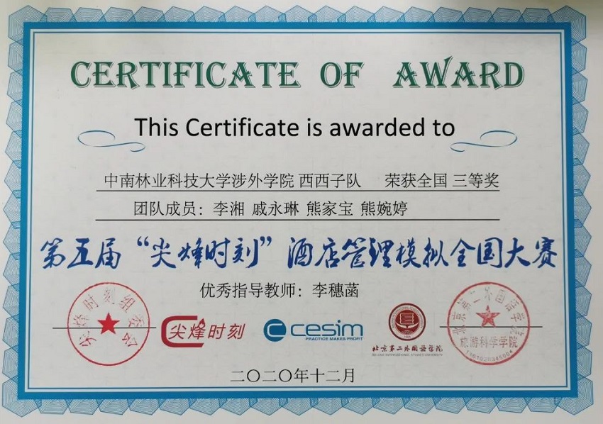 【喜讯】 中南林涉外学子荣获第五届“尖烽时刻”酒店管理模拟大赛全国总决赛三等奖