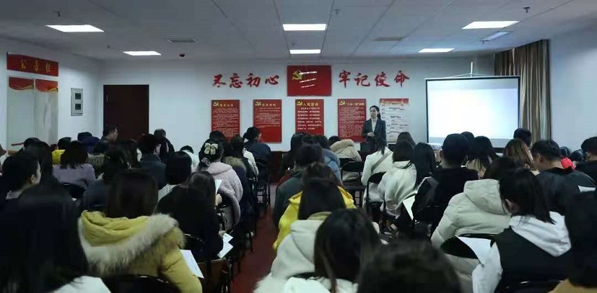 学工处蒋文艳老师结合学生党员发展工作实际情况,首先对发展党员新细则做了详细解读,包括修订特点、修订内容等;其次是对入党积极分子阶段、发展对象阶段、预备党员阶段等每个环节的要求做了详细讲解;最后对我院2020年上半年学生党员发展工作中存在的问题与不足作了小结。