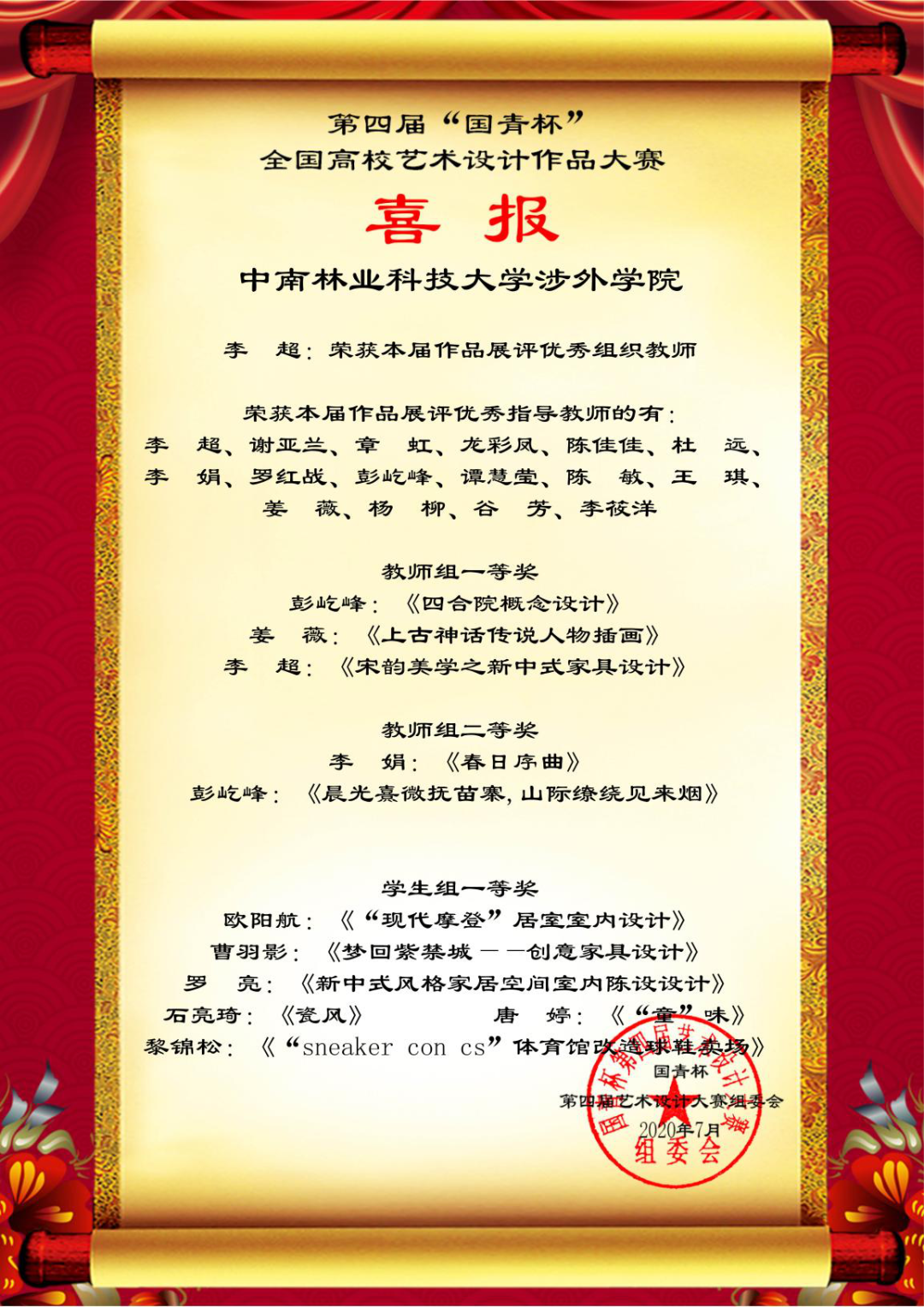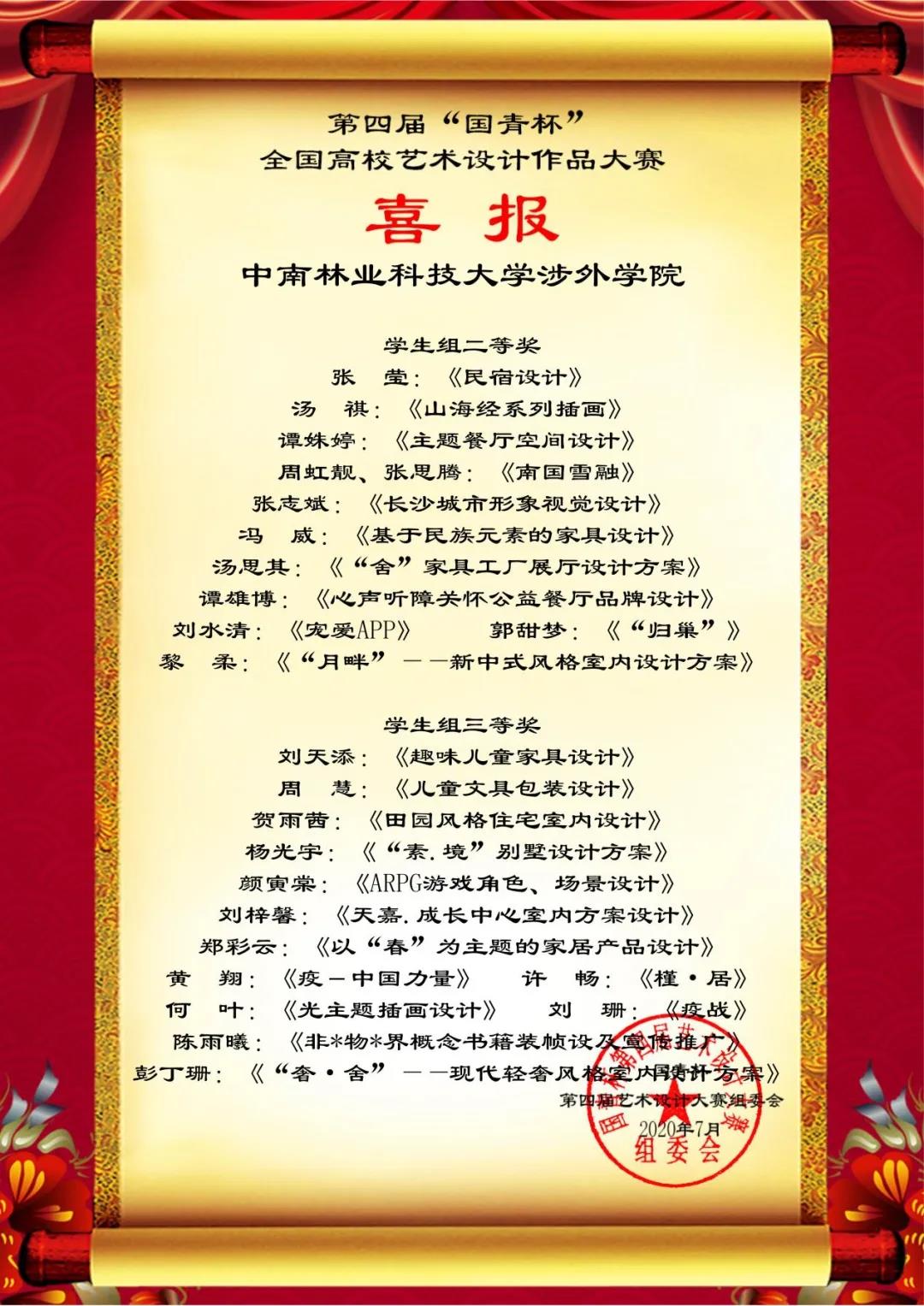 喜报传来,由中国人生科学学会艺术与设计教育分会举办的第四届“国青杯”全国高校艺术与设计作品征集评选活动圆满结束,中南林涉外学院传媒与艺术设计学院师生在此次大赛中再创佳绩。