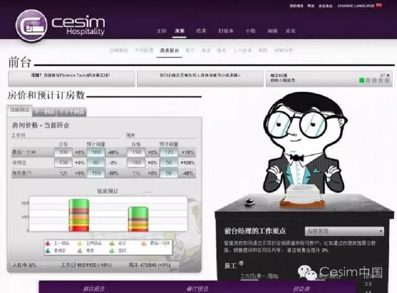 “尖峰时刻”酒店管理模拟大赛源自芬兰,赛事采用芬兰CESIM研发的Hospitality酒店管理模拟平台,以酒店高层管理者的身份模拟运营一家国际酒店。旨在提升参赛者的团队协作能力和决策管理能力,打破理论和实践的藩篱。我院参赛队伍中大四年级酒店实习归来的学生充分发挥了他们在五星级酒店实习实践所学知识,在比赛中,果断决策、表现沉稳;与大二年级学生组成的跨年级队伍,默契协作,形成优势互补,充分展现了团队的力量。