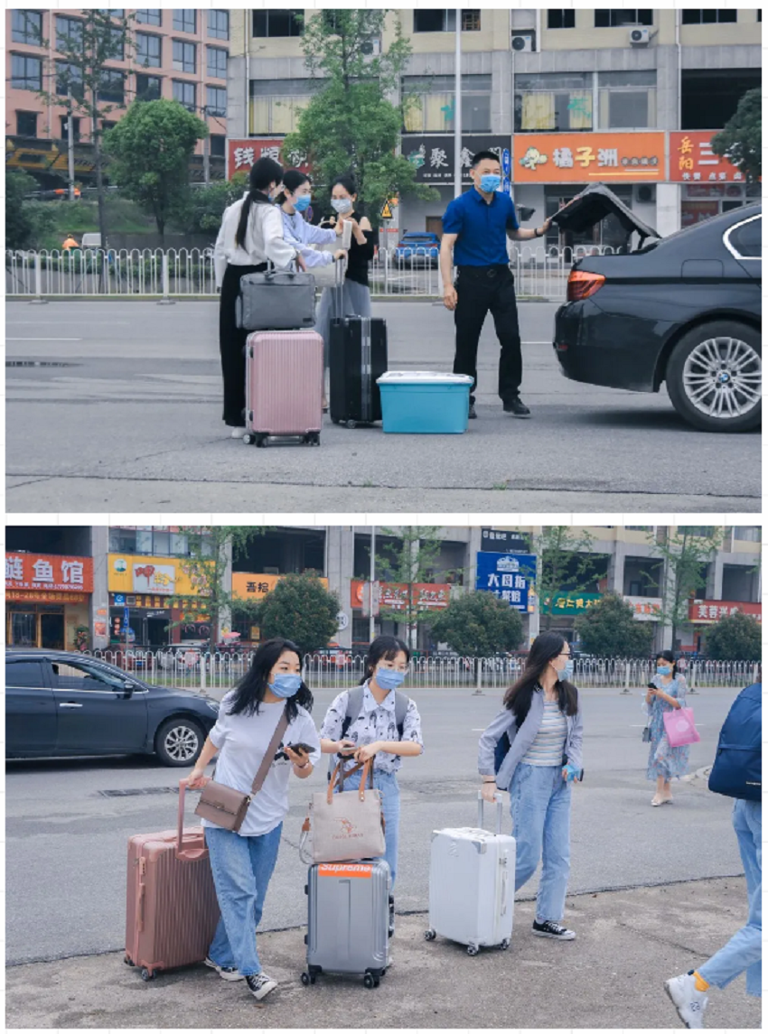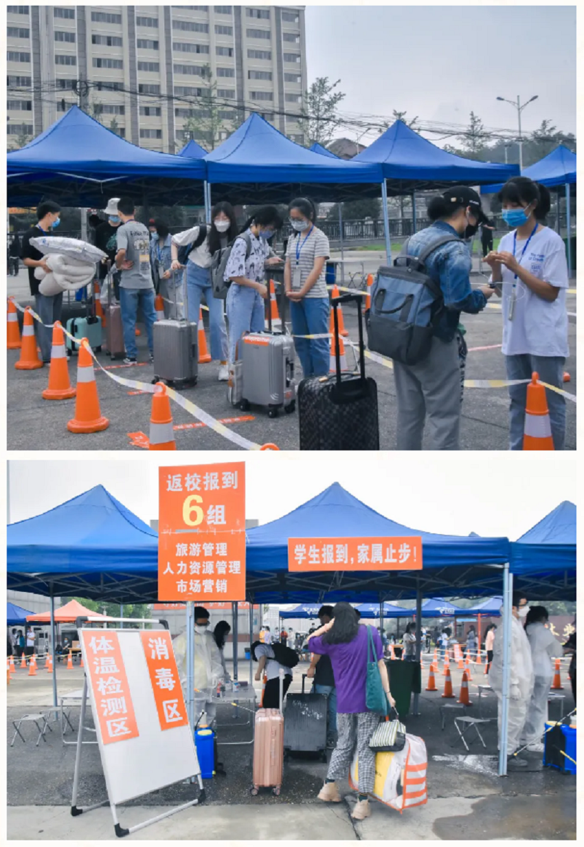 入校准备,伴着清晨的微光,工作人员、志愿者们早早地上岗,等候首批返校的学生,为确保同学们顺利、平安返校,学院做了充足的准备,从校门口的消毒、检测与查验,到宿舍二次身份登记和体温检测,各领导、行政人员、辅导员、教师,主动请缨,冲锋在前,为返校学生保驾护航,“你们辛苦啦,谢谢你们的守护”,安全返校,上午,返校学生陆续抵达学校门口,路旁为私家车设定了临时停靠点,“即停即走”,“学生下车,家属返程”,为减少人流密集的现象,学院共设8个报到点,各个专业都有入校“关卡”耐心引导,在志愿者的帮助下,学生们快速进入相应的报道点,有序排队,等待检测,严格检测,报到点设置了行李消毒区、体温检验区、身份核验区、临时医学观察区,制定了严格的入校流程,实施“一消二测三洗四查”报到机制,做好学生口罩更换、行李消毒、体温测量、健康信息登记、查验身份信息、报到登记等工作,确保学生健康安全地返校,有序入住,终于进入校园啦,走着再熟悉不过的路线,回到宿舍楼,我回来啦!宿管阿姨为学生进行二次体温检测和身份核验,学生领取学院准备的体温计和酒精,后勤人员暖心加班为学生宿舍清运垃圾。
