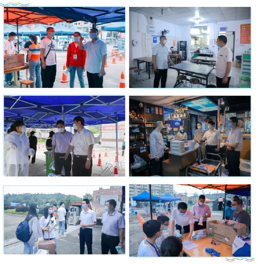 董事长朱定强、院长周志宏、院长助理张康龙前往学生报到点、商业楼、食堂,检查开学工作的具体落实情况,并走访慰问了工作人员以及返校师返校同学,详细询问了学生住宿及返校后的情况。
