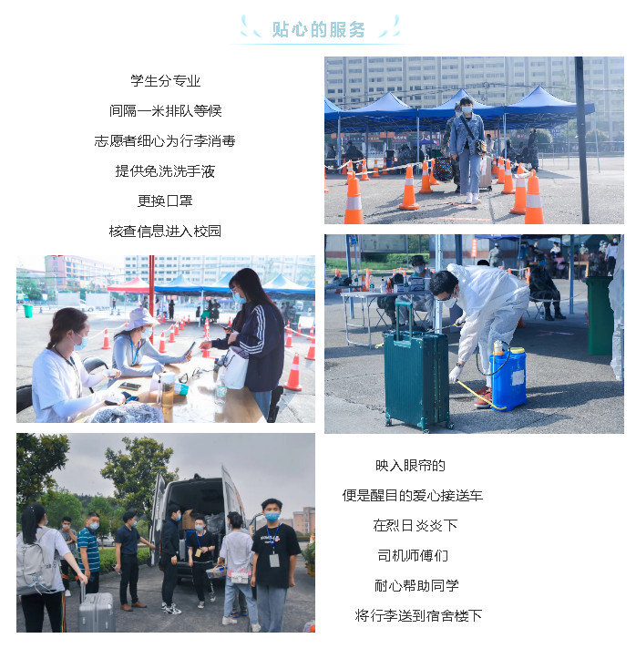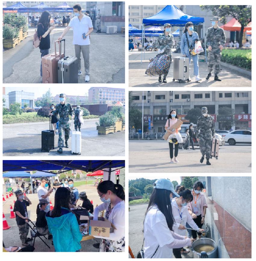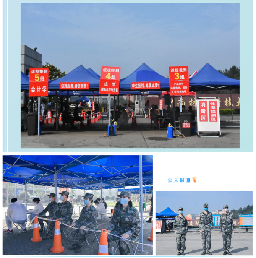 赤日炎炎,防护服内汗如雨下,却依旧阻挡不了迎接学生到来的喜悦之情,为确保学生们返校工作顺利进行,志愿者、辅导员老师等相关工作人员早早地就来到自己的岗位上。