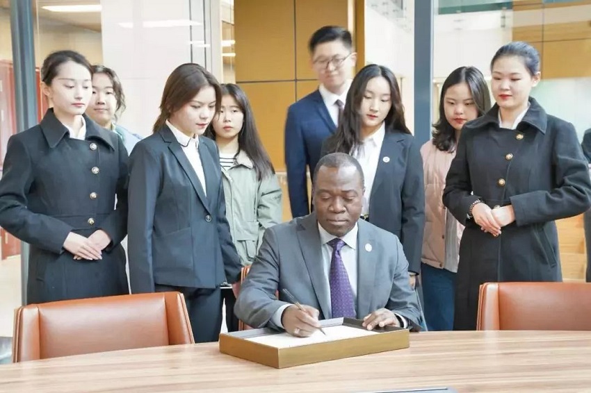 联合国人口基金驻华代表处代表洪腾博士及各位领导嘉宾与此次培训班的42名学员在学生礼仪的引导下踏上红毯,嘉华学院学生代表持中国国旗、联合国旗帜在红毯两侧列队欢迎,嘉宾与学员们在签名墙前签名、合影留念。