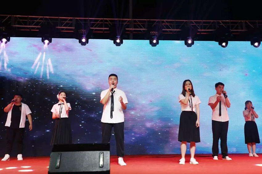 艰难困苦,玉汝于成。董事长朱定强以一首《不忘初心》让人重温了革命先辈用理想和信念丈量的伟大远征,致敬新中国的同时,也激励着在场的每一位要走好自己的人生长征路。随后,中国好声音长沙赛区组委会赛事总监陶明月带来的《月牙湾》,借歌词鼓励大家在勇敢追爱,保存心中美好,给晚会营造了一个温馨美好的氛围。青年歌手黄翼献唱的《把一切献给党》,唱出了这70年来党和人民共同走过的风霜雨雪,也唱出了涉外师生同心共筑中国梦的坚定信念!