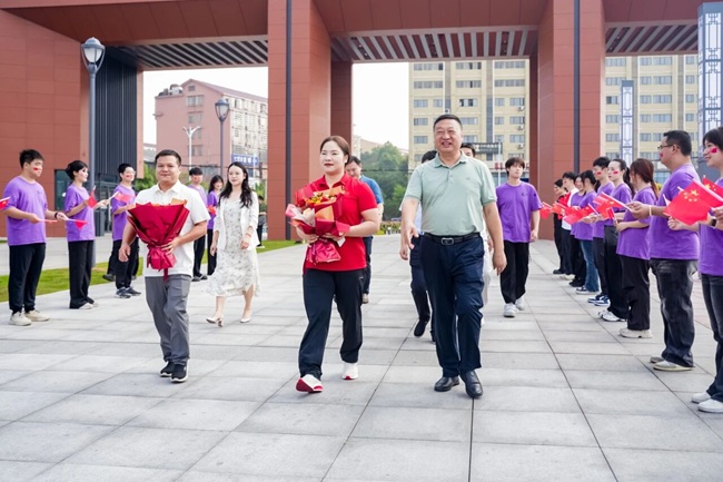 清晨的校园洋溢着热烈氛围。两位湘籍奥运冠军一进校门,学生代表庄重献上鲜花,表达全院师生对他们的崇高敬意和热烈欢迎。学院领导朱定强、李雄华、孟志波、张康龙、王佳怡与师生代表一同与奥运冠军合影留念。