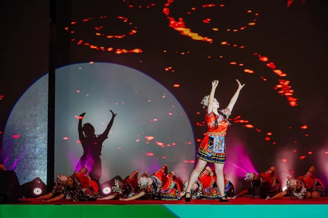 苗族的《苗蓝》舞蹈向世人展现了国家非物质文化遗产苗族蜡染的永恒魅力以及苗族富有诗情画意的民俗。舞台上的舞者们动作轻盈流畅,时急时缓,恰似溪水般蜿蜒流淌,展现出一种细腻且灵动的美感,为我们更好地了解苗族历史文化、推动非遗在青年群体中传承培育了肥沃土壤。