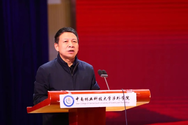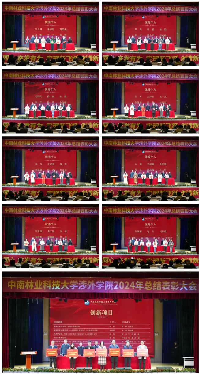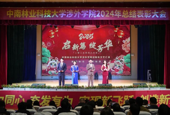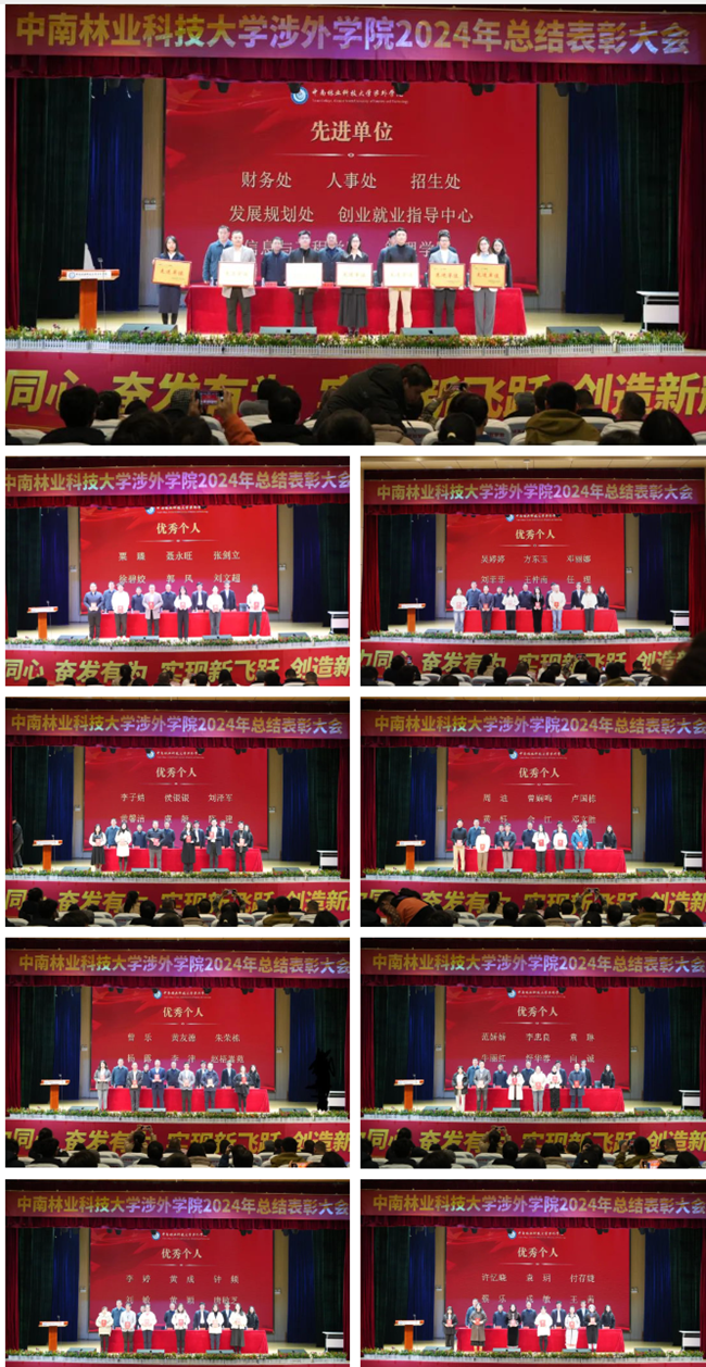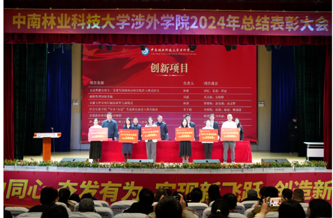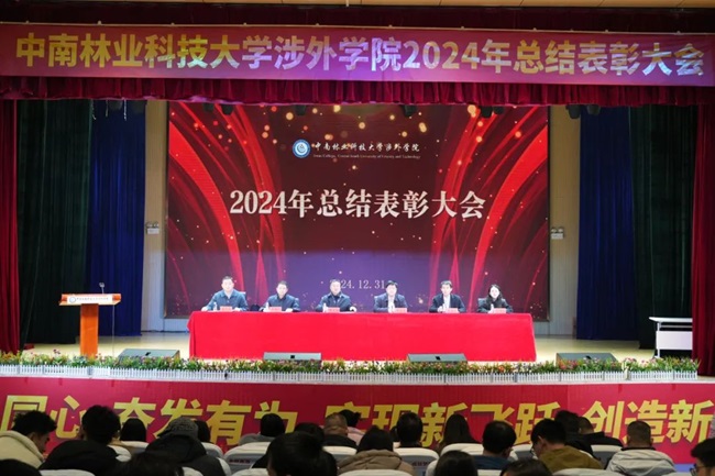 师德馨且远,育人创佳绩。为全面总结一年来我院在“立德树人”根本任务上的深耕实践,展示教育事业高质量发展的坚实步伐与丰硕成果,表彰一批为学院各项工作发展做出突出贡献的集体及个人,12月31日,中南林业科技大学涉外学院2024年总结表彰大会在学术报告厅隆重举行。学院领导朱定强、周志宏、李雄华、张康龙、王佳怡出席大会,全体教职工及学生代表齐聚一堂,共同见证这一荣耀时刻。大会由党委副书记孟志波主持。会场气氛庄重热烈,彰显了全院上下凝心聚力、奋楫前行的磅礴力量。