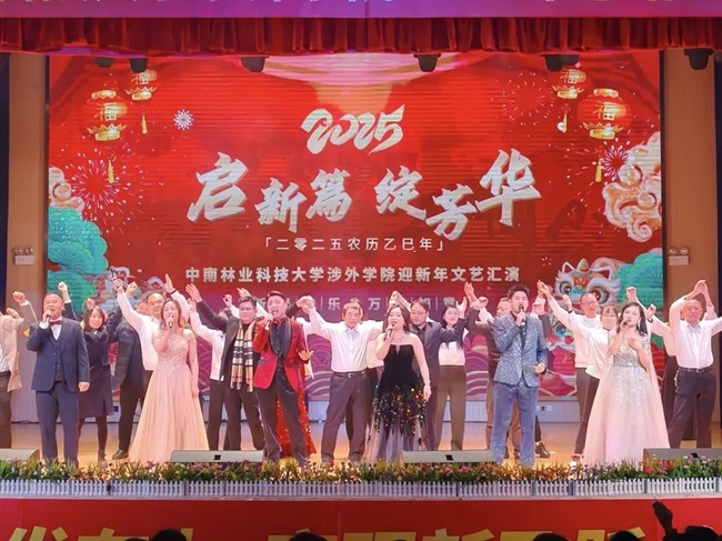 “我和你,心连心”,语言文化学院带来歌舞节目《我和你》别具匠心,心与心紧紧相依,情与情紧密相连。经济学院弹唱原创歌曲《远航》和歌舞节目《青苹果乐园》奏响乐章,灵动的舞姿与高昂的歌声相互交织,仿佛已踏上充满希望与憧憬的远航之路。“青春如初春,如朝日,如百卉之萌动”,管理学院歌曲《有我》唱出中南林涉外师生们昂扬向上的自信与担当。由传媒与艺术设计学院带来的节目《新年快乐》匠心独运,一幅妙趣横生的校园生活画卷在舞台上徐徐展开。校团委大学生艺术团合唱《光亮》《不要慌太阳下山有月光》歌声汇聚希望与从容,凝聚起振奋人心的力量,激励师生迈进新征程、奋发新理想。马克思主义学院情景剧+朗诵《法网柔情》,将专业知识与艺术表演深度相融,网络诈骗的种种情形以及防范要点透过表演巧妙呈现,为师生敲响防范网络诈骗的警钟。信息与工程学院《上春山》将歌曲与舞蹈相结合,乐声中透着春的芬芳,带来新年的光明而柔软的希望。校团委大学生艺术团《八百里洞庭我的家》《浏阳河》《山水湖南歌曲联唱》,曲调绵长,舞姿曼妙,勾勒出湖南的秀丽山水与风土人情。最后,机关单位和体育课部《篇章》细腻的旋律轻抚人心,当过往与希望交织,无论风雨、只问明天!