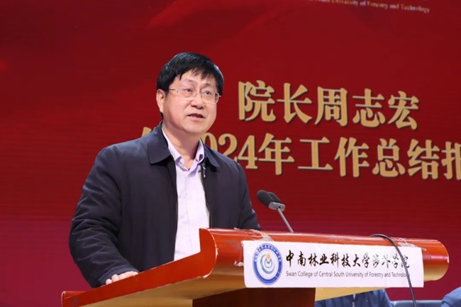 党委书记李雄华宣读《关于表彰2024年先进集体和优秀个人的决定》以及《关于表彰创新项目的决定》。2024年,中南林业科技大学涉外学院涌现出一批在学院发展进程中勇于担当、奋发有为的集体和个人,充分展现了学院教职员工忠诚履职、爱岗敬业、竭诚奉献的优秀品格和精神风貌。