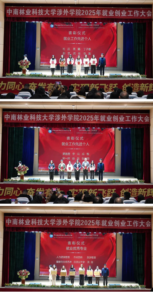 副院长张康龙宣读《关于表彰2024年度就业创业工作先进单位、先进个人和优秀专业的决定》与会领导为受表彰的个人、专业、单位颁奖