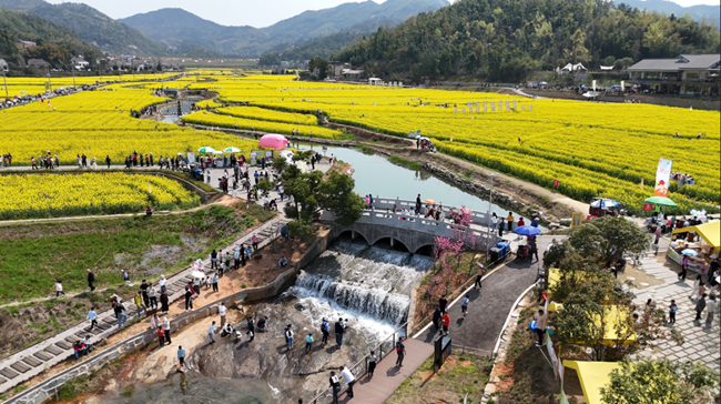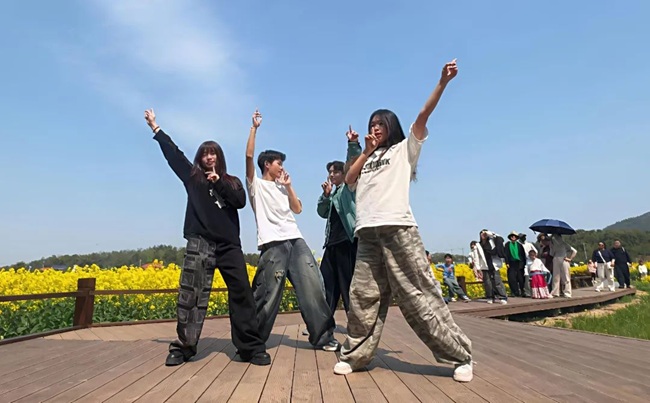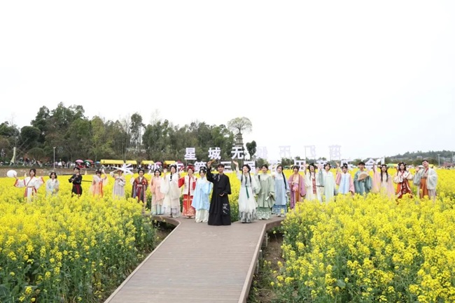 阳光透过油菜花的间隙洒下,游园会入口处,楚源国学社的学子们身着汉服,手持折扇,轻盈地穿梭在花海中,为游客指引方向,他们的衣袂随风轻扬,一颦一笑间尽显古韵风华。