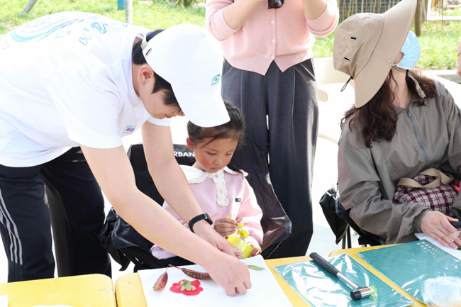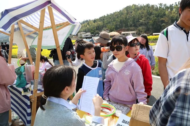 “我非常喜欢制作漆扇活动,我做得精美吗?”一名外国友人在非遗漆扇体验区里手持细笔,调配漆料,将传统技艺的魅力一点点融入扇面。拓染手工包体验区中,新鲜的油菜花叶被铺在棉布上,被轻轻敲打;滴胶压花和油菜花风车体验区坐满了小朋友,大学生志愿者们一双双温暖有力的“大手”牵起稚嫩的“小手”,悉心引导,耐心启发。