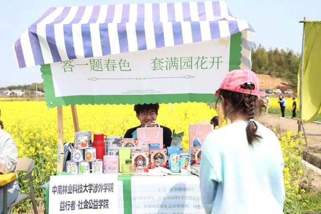 为积极响应国家乡村振兴战略号召,引导青年学子用专业赋能公益,服务乡村发展,3月22日,中南林业科技大学涉外学院携手长沙市望城区茶亭镇政府举办“油菜织金毯 公益传春声”第五届茶亭花海艺术季公益活动,百余名大学生走进茶亭花海,发挥专业优势,积极参与视觉艺术展、社团游园会等系列公益活动,开启一场大学生的组团“出圈”行动。