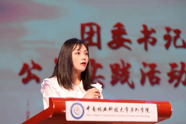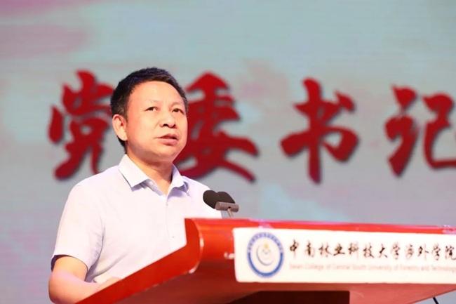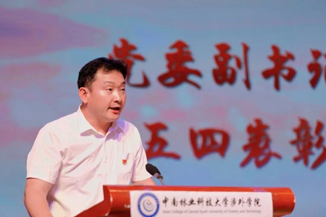 中南林业科技大学涉外学院党委书记李雄华作总结讲话。他代表学院党委向获得表彰的优秀集体及个人表示热烈祝贺,带领与会师生回顾106年前五四青年高举“爱国、进步、民主、科学”旗帜的历史,强调五四精神时代价值,充分肯定了青年师生在学术钻研、校园文化建设、竞赛创新及志愿服务等方面传承践行五四精神的突出表现。