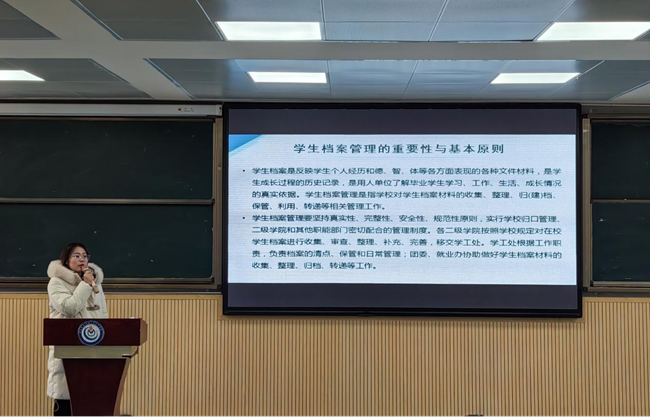 第二场培训由学工处综合干事廖涵老师就学生档案管理事项进行分享,主要介绍了学生档案管理的原则与重要性、档案管理的六项关键流程以及各项流程中的注意事项。
