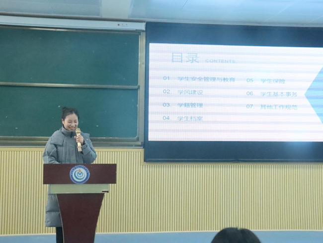第三场培训由学工处综合主管任理老师围绕“学生日常行为管理及准则”和“学生入伍退伍事务办理”展开,从学生医保、学业预警、学籍异动、学风教育等日常事务做了指引,针对学生入伍退伍事务常见问题做了详细解答。