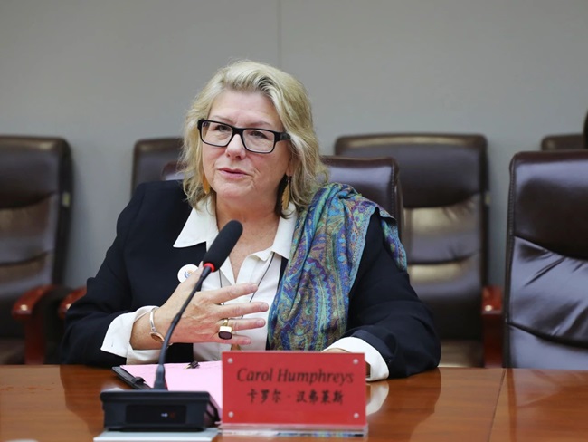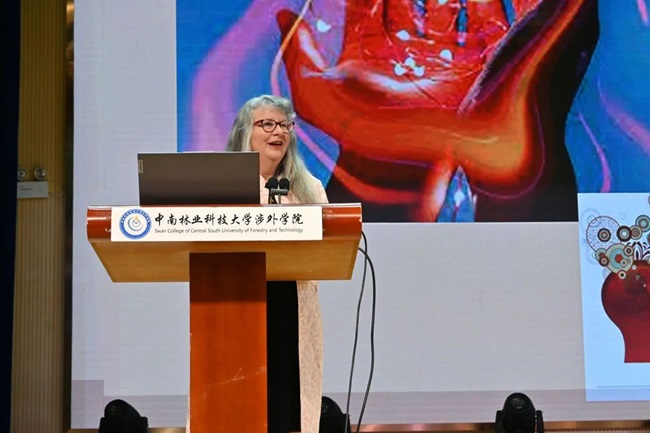 美国索菲亚大学校长卡罗尔·汉弗莱斯博士表示很高兴再次到访中南林涉外学院,并对学院开设多个国际实验班表示祝贺。卡罗尔·汉弗莱斯博士从学科发展、校园环境及学校国际化战略等方面分享了索菲亚大学近一年的发展与变化。她表示,中南林涉外学院与索菲亚大学均致力于学生发展和人本发展,诚挚邀请中南林涉外学院一同参与全球心理健康项目,对双方未来更紧密的合作充满信心。