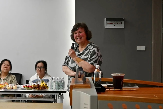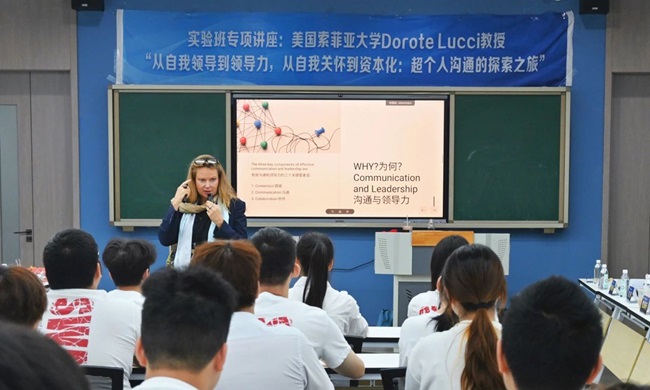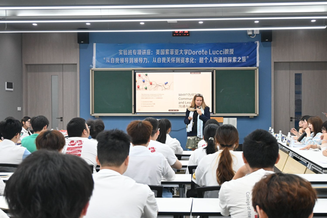 多罗特·卢奇博士在信息工程国际实验班专项交流会上,就《从自我领导到领导力,从自我关怀到资本化,超个人沟通的探索之旅》这一主题,进行了精彩的分享,她以自己在心理学领域的丰富经验,与在场师生进行深入交流。