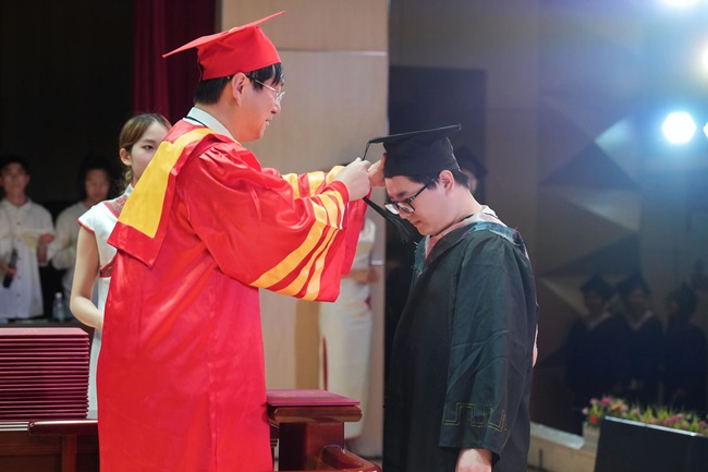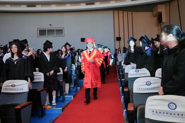中南林业科技大学涉外学院学位评定委员会主席、院长周志宏教授依次为获得学士学位的毕业生授予学位。毕业生们接过毕业留念信物,合影定格,他们将携着句句祝福,奔赴新的航向,探寻下一处风景。