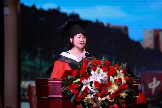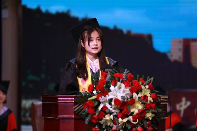 毕业生代表会计与金融国际实验班黄雪同学发言。她代表全体毕业生向辛勤培育同学们的母校、老师和亲友们表达真挚的感激,并回味四年大学历程,感慨今后虽然大家将走不同的路,追不同的梦,但始终不变的是中南林涉外人的身份,以及追求人生理想的热爱,不负韶华,继续前行。