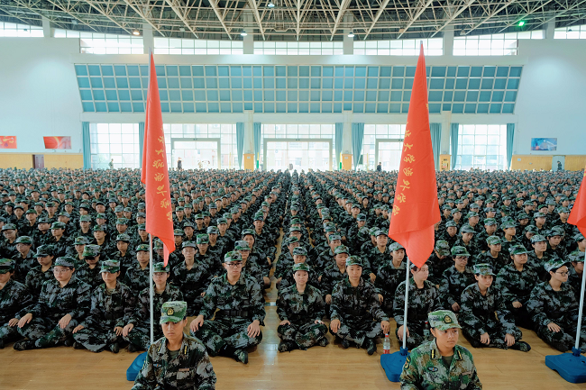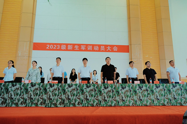 伴随着雄壮激昂的国歌,全体庄严奏唱,激昂的旋律在馆内回荡,军训动员大会正式拉开帷幕。