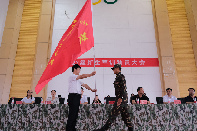 随后,院长周志宏为2023级军训团授旗,军训团代表接过旗帜。