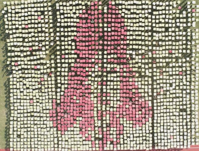 军训文化方队手持红黄两色纸板摆出请党放心、强国有我、向雷锋同志学习、雷锋头像等字样。