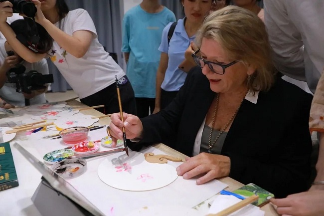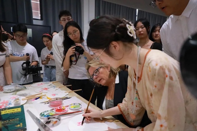 Dr.Carol Humphreys在国风画扇的吸引下,身临其境地感受水墨画笔墨技法的传神之处,用有限的笔墨,阐释出中国美学无穷的意境空间,在象征团圆、美满的团扇上绘下长沙市市花——杜鹃花。