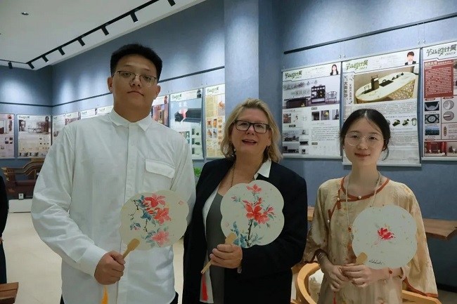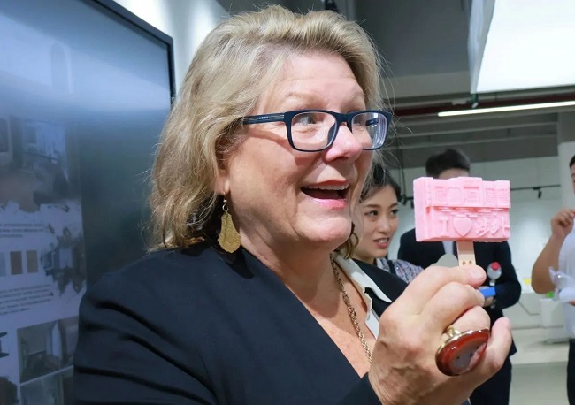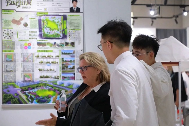 在传媒与艺术设计学院师生的邀请下,Dr.Carol Humphreys一行参观传艺学院艺术设计展厅,欣赏了我院优秀学子的设计作品,品尝了我院设计的文创雪糕。Dr.Carol Humphreys对学生们的作品表示赞叹,同学们能够将所学知识与创意完美地融入到作品之中,并对作品中展现的中国传统文化元素表现出浓厚兴趣。