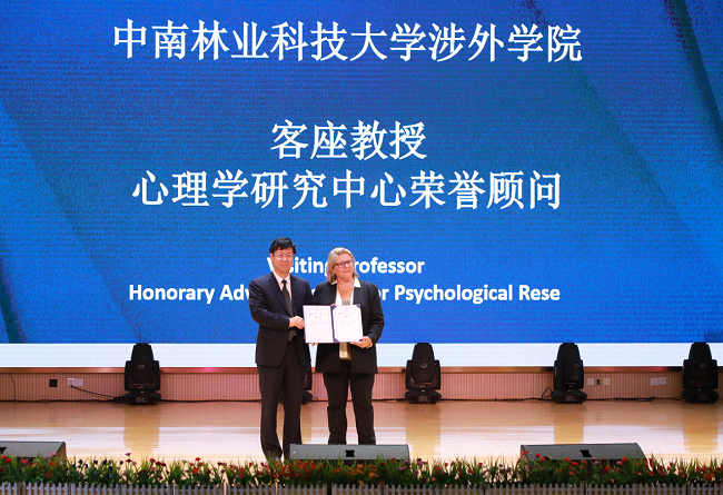 院长周志宏为Dr.Carol Humphreys校长颁发中南林业科技大学涉外学院心理学研究中心荣誉顾问、客座教授聘书。