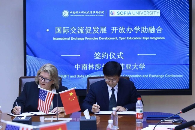随后,中南林业科技大学涉外学院院长周志宏与索菲亚大学校长Dr. Carol Humphreys签订合作备忘录。