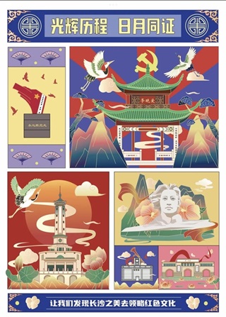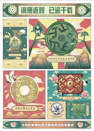 其中,以中南林业科技大学涉外学院邓存存作品《漆吾》为代表,其在传统文化与现代设计之间巧妙地取得平衡,从湖南博物院的狸猫纹盛食漆器中获得灵感,结合现代设计风格,将传统元素提取并融入到现代家具设计里,最终其也荣获“遇见长沙”·创意奖。而另一位“遇见长沙”·特色奖的获得者肖慧同学则以历史建筑、红色文化和历史文物为切入点,巧妙地将经历岁月洗礼后最能代表长沙的元素提炼出来,通过红、黄、绿、蓝、紫等多种鲜艳的色彩,赋予作品《长沙风采》丰富的视觉效果。