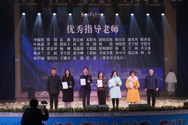 湖南省教育电视台党委书记、台长蓝兵、中南林业科技大学涉外学院董事长朱定强为优秀指导老师代表颁奖。