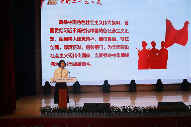 永远跟党走,奋进新征程。为深入学习宣传贯彻党的二十大精神,引导广大师生把思想和行动统一到党的二十大精神上来,将党的二十大精神切实转化为加快高质量发展的思路举措和履职尽责的实际行动,根据学院党委的统一部署,3月23日下午,党的二十大精神宣讲会在我院学术报告厅举行,党的二十大代表、中南林业科技大学袁红梅教授以《高举旗帜勇毅行,起航奋进正当时——深入学习贯彻党的二十大精神》为题做专题宣讲。学院领导朱定强、周志宏、章元日、盛均全、马宗艳、孟志波、张康龙、王佳怡,全体教职工以及学生代表参加了此次宣讲会,宣讲会由学院党委副书记孟志波主持。