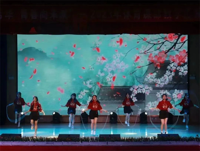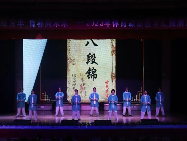 汇报演出分为奋蹄扬鞭逐青春,披荆斩棘搏青春,鲜衣怒马燃青春三个篇章。首先亮相的是啦啦操《偶像万万岁》,动感的音乐让整个舞台都洋溢着青春的热情,同学们意气风发,激情飞扬,踏着韵律,尽现青春风采。长拳《武魂》紧随其后,表演者们招招有力、掌掌带风,一招一式中,流转着博大精深的武术文化。《大鱼海棠》中瑜伽表演者们在悠扬的音乐中保持伸展与扭转相协调,支撑与柔韧相结合。有氧拉丁《Latin girl》的舞者们跟随韵律跳动,指尖划出的弧线不断对视觉发起冲击。静心舒缓的音乐声中,太极拳《书韵》的表演,同学们将刚柔并济的手法自然地附于书法形式之上,整个现场都切身感受到了太极与书法融合的艺术之美。充满活力与创造性的爵士舞《晨曦》充分地展示了当代大学生的自信与热情。飒爽英姿的健美操《日出》尽展大气豪迈,展现出新时代青年的阳光活力。散打健儿们《男人当自强》一招一式迅猛敏捷、亮眼夺目。伴随着舒缓轻柔的音乐,同学们生动诠释了养生气功《八段锦》“意动行随神形兼备、松紧结合动静相兼”的特点。力量的角逐、青春的风采在花式跳绳表演《桃花笑》中展现,以激昂青春迎接未来。形体礼仪《形之美 礼之雅》的同学们气质优雅,一颦一笑皆是“礼”,一举一动皆是“仪”,举手投足间尽显端庄。最后,伴随着一支优美的手势舞整场汇演落下帷幕。