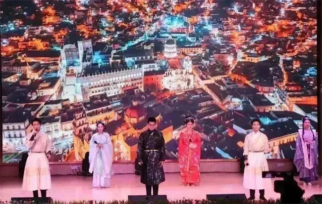 “华夏复兴,衣冠先行。”身着汉服的同学们站在幕前讲述历史的过往。古代朗诵《梦寻九州》让文字在历史脉络里呼吸,穿越千年时光,华夏儿郎呼唤礼仪之邦。