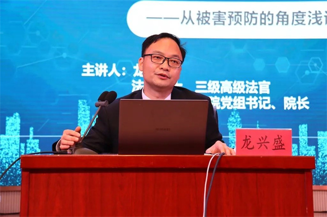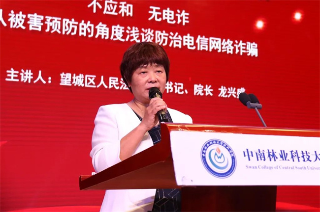 长沙市望城区人民法院党组书记、院长龙兴盛博士在学术报告厅作《不应和,无电诈——从被害预防的角度浅谈电信网络诈骗》主题讲座,讲座由副院长马宗艳主持。