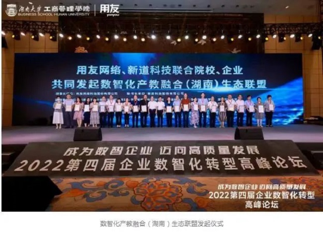 在湖南省工信厅、教育厅的指导下,用友网络、新道科技股份有限公司联合我院及中南大学、湖南大学、湖南师范大学在内的省内10所高校及10家企业联合发起“数智化产教融合(湖南)生态联盟”,我院被授予数智化产教融合(湖南)生态联盟副理事长单位。生态联盟以“促进教育 融于产业 服务院校 共育新人才”为宗旨,通过建立产教融合新生态,搭建校企合作的共享平台,实现教育链、人才链、产业链、创新链有机衔接,打造新时代具有中国特色的产教融合联盟新范式,为湖南省企业数智化转型提供支撑。