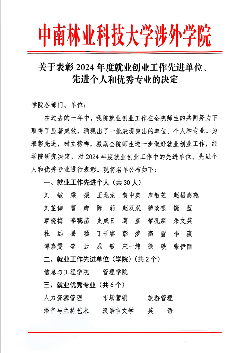 关于表彰2024年度就业创业工作先进单位、先进个人和优秀专业的决定
