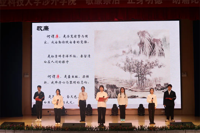 “清是廉之本,廉是德之基”。为进一步推动廉洁思想、清廉作风、清廉文化在学校落地生根,营造风清气正的学校氛围,中南林业科技大学涉外学院语言文化学院于3月23日18点在报告厅举办了“敬廉崇洁,正身明德”朗诵比赛。