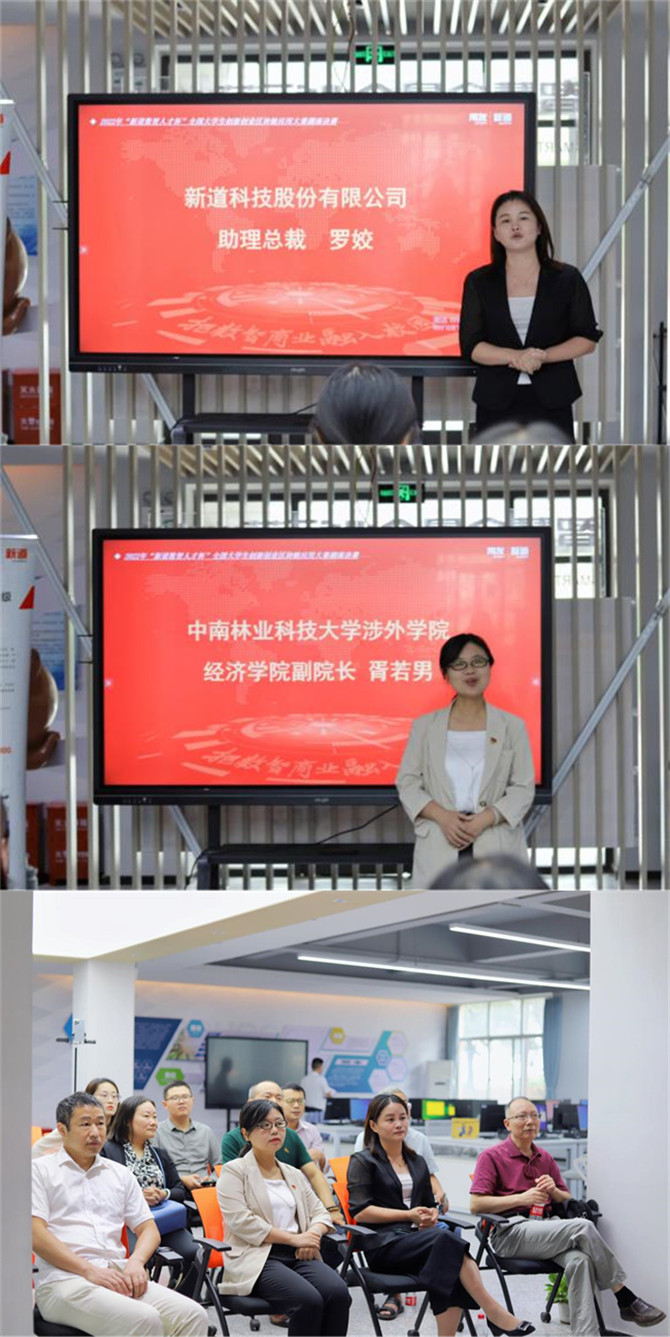 中南林涉外学院经济学院副院长胥若男代表学院致欢迎辞,她首先对各位专家的莅临表示欢迎和衷心感谢。胥若男副院长简要介绍了学校概况、办学特色以及育人水平,她希望各参赛队伍严格遵守赛事规则,发挥出水平、展现出风采,激发出大学生们在区块链应用领域的创新创业热情,进一步加强兄弟院校之间的交流与合作。新道科技股份有限公司助理总裁罗姣也向参赛院校声明本次比赛的目的和意义旨在推进区块链数字产业实践育人工作的开展,深度对接互联网+创新创业产业赛道命题,提高区块链人才的培养质量,并表达了对本次大赛圆满举办的美好祝愿,至此比赛正式拉开序幕。