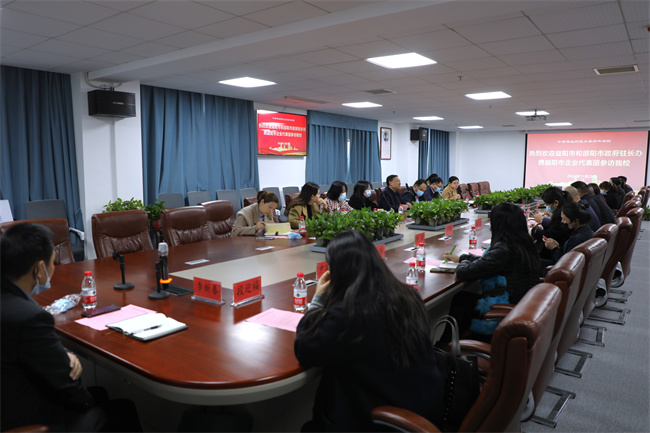 为践行二十大报告精神,推动我院创新创业及应用型人才培养,助力地方经济高质量发展,11月23日下午,益阳市政府驻长沙办事处王育民主任、邵阳市政府驻长沙办事处胡文伟副主任携益阳市企业家代表团来我院参观访问,并进行校政企三方联合共建直播电商平台座谈会。学院董事长朱定强、党政办负责人粟臻,财务处负责人刘丽、教务处负责人方东玉、管理学院副院长肖菲、经济学院副院长胥若男、二级学院代表在知行楼六楼视频会议室参加会议。经济学院副院长胥若男主持会议。