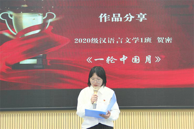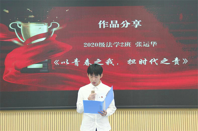 随后,一等奖获奖者何倩、二等奖获奖者贺密、三等奖获奖者张运华作为获奖学生代表向同学们分享精彩的作品故事,他们以真情实感讲述自己眼中的伟大祖国,描绘心中的远大理想,充分展示新时代青年今朝为我少年郎,敢问天地试锋的决心。